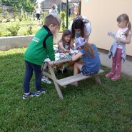Kako bismo zaokružili i prezentirali rad na projektu “U svijetu priča i bajki” organizirali smo Projektni dan. Zamišljen kao izložba radova na projektu u vidu plakata, slikovnica i mape u hodniku vrtića. Roditelji su bili pozvani da nam se pridruže u vremenu od 9-10h kako bi zajedno proveli planirane aktivnosti. Aktivnosti su motivirane pričom “Cvijet koji leti”, a od sredstva i materijala za rad ponudili smo temperu, kistove, papir (bojanje cvjetova), plastične žlice, bijeli papir, kolaž papir raznih boja izrezan na komadiće, ljepilo u stiku, flomastere (leptirići), plastelina i plastične tanjuriće za miješenje i oblikovanje (leptir, cvijet). Tokom trajanja aktivnosti djeca su se mijenjala u radu sa ponuđenim materijalom. Od velike pomoći bili su i prisutni roditelji i jedna odgojiteljica, koji su sudjelovali u radu sa svom djecom pomažući im kad je to bilo potrebno.